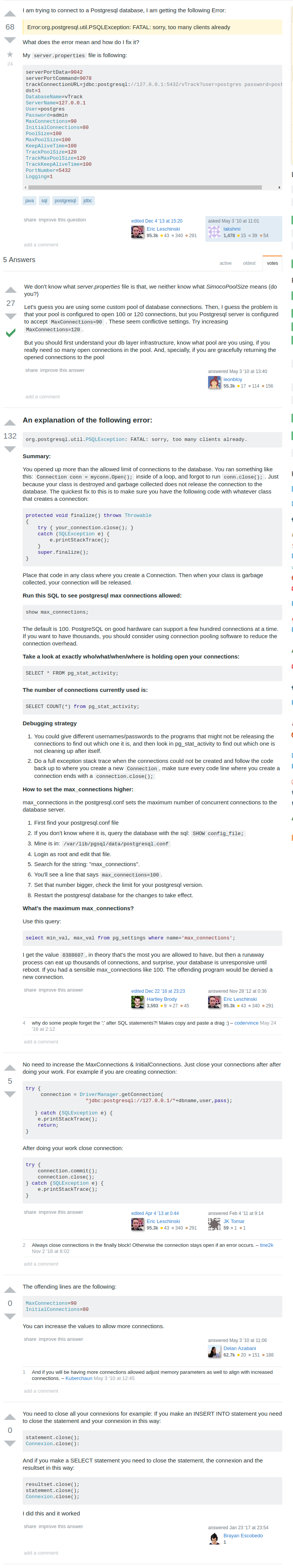 org.postgresql.util.PSQLException: FATAL: sorry, too many clients already August 13, 2019August 13, 2019 https://stackoverflow.com/questions/2757549/org-postgresql-util-psqlexception-fatal-sorry-too-many-clients-already Share this: Share on X (Opens in new window) X Share on Facebook (Opens in new window) Facebook Like Loading... Related